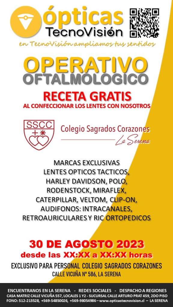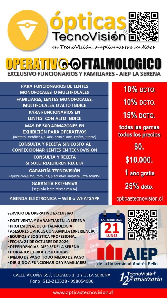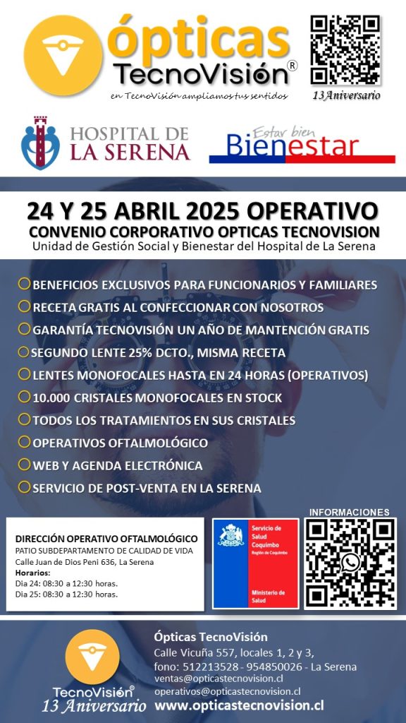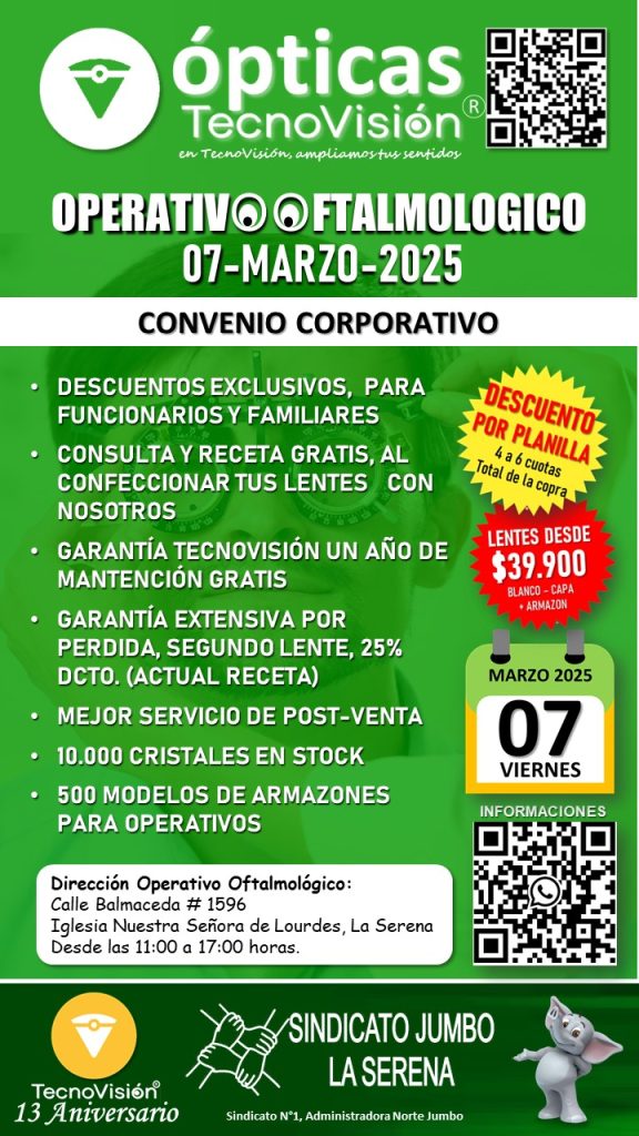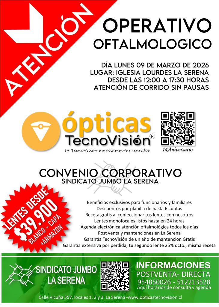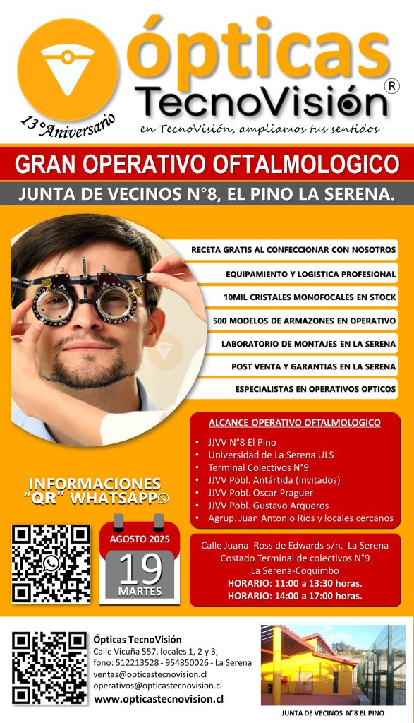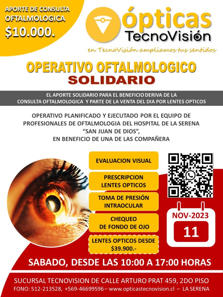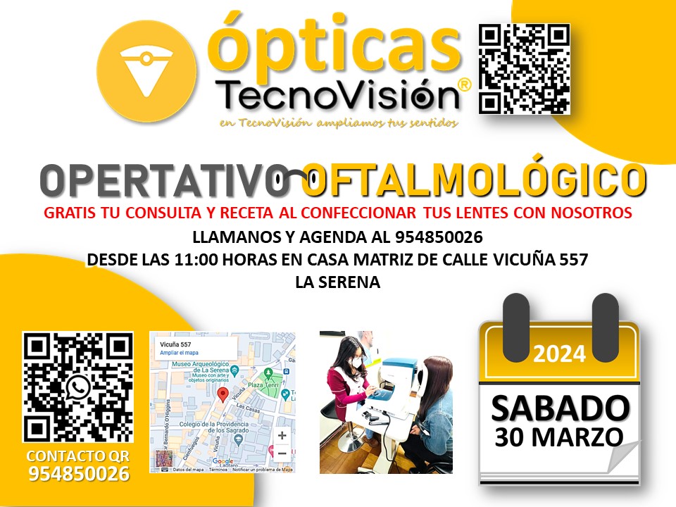 SABADO 30 DE MARZO DE 2024, DESDE LAS 11:00 HORAS, REALIZAREMOS UN OPERATIVO OFTALMOLOGICO PARA TODO PUBLICO DEDDE LOS 4 AÑOS DE EDAD EN ADELANTE, ESTE OPERATIVO LO REALIZAREMOS EN LA CASA MATRIZ DE TECNOVISION, CALLE VICUÑA 557, LOCALES 1 Y 2 DE LA SERENA.