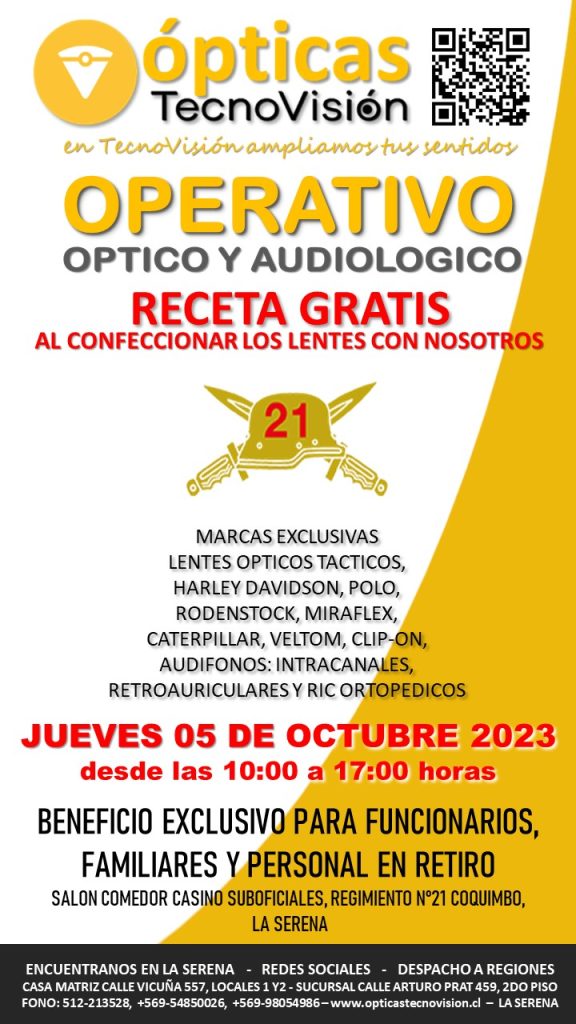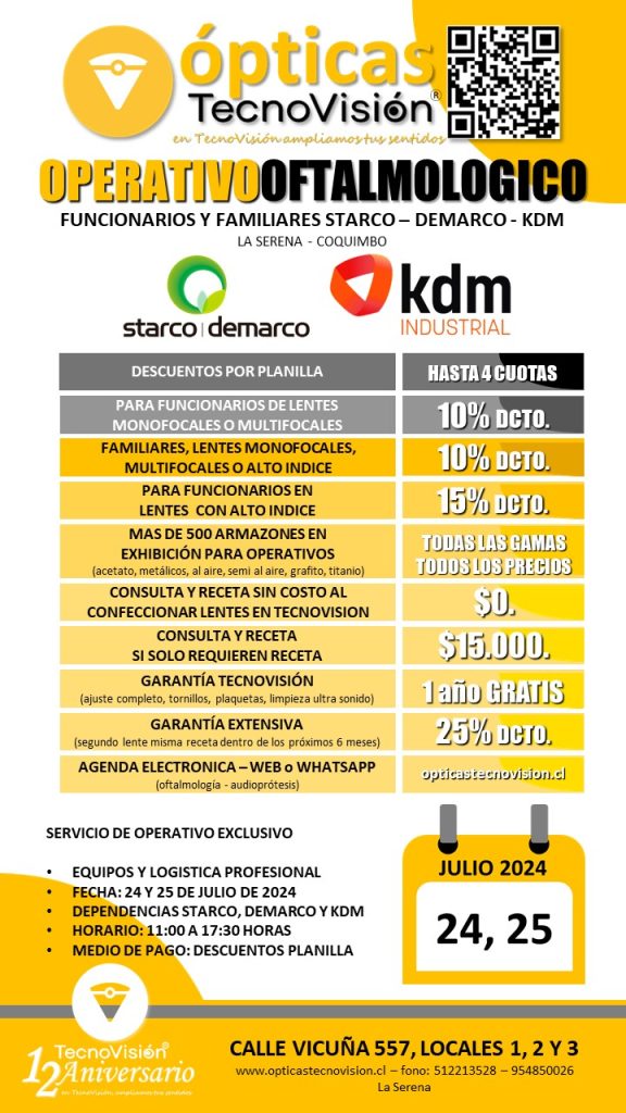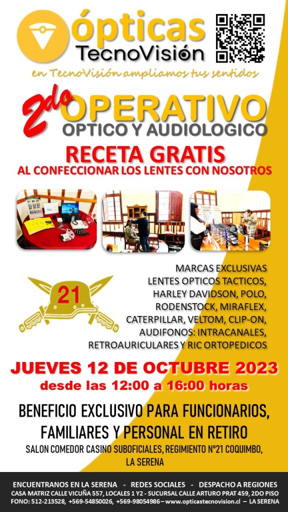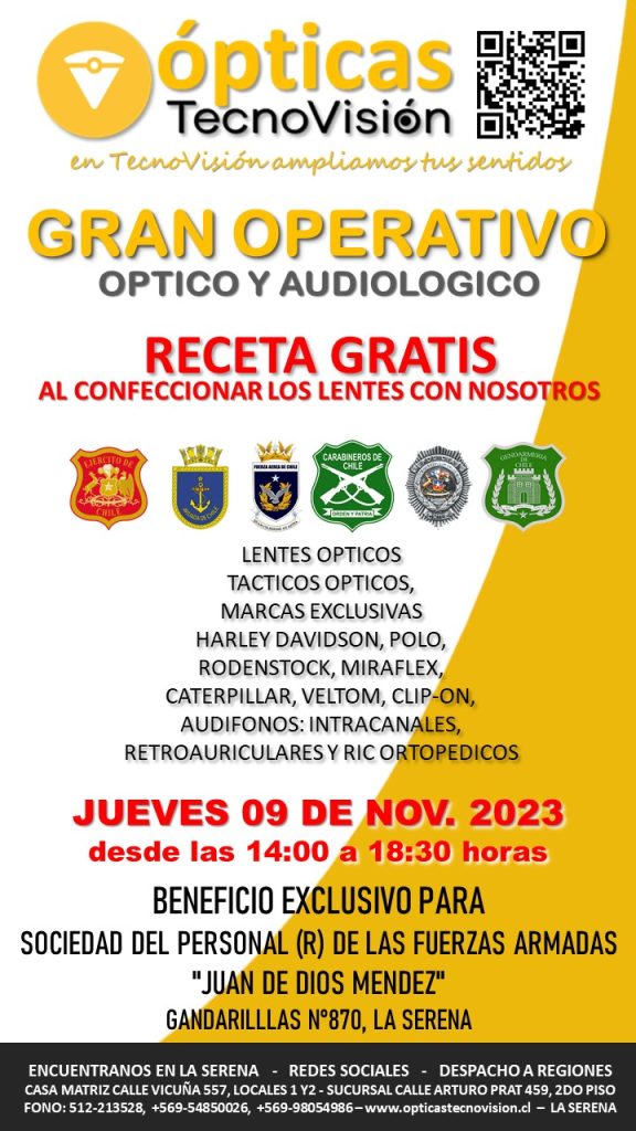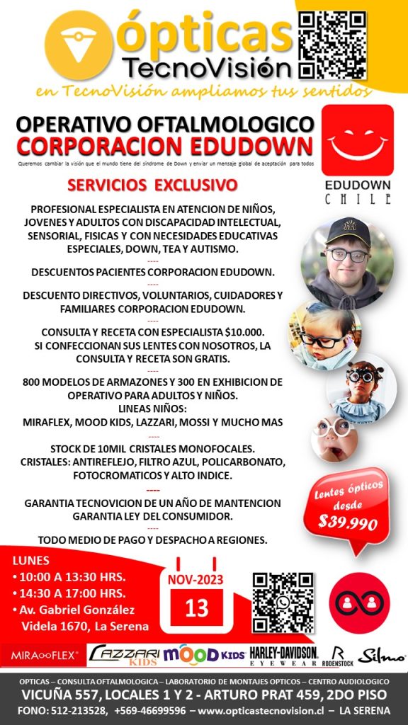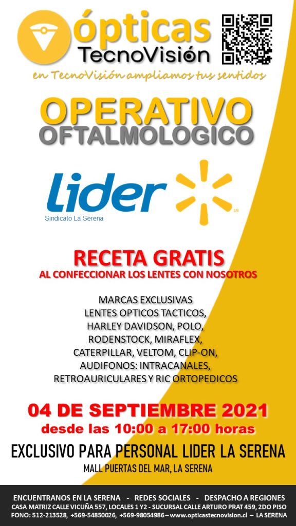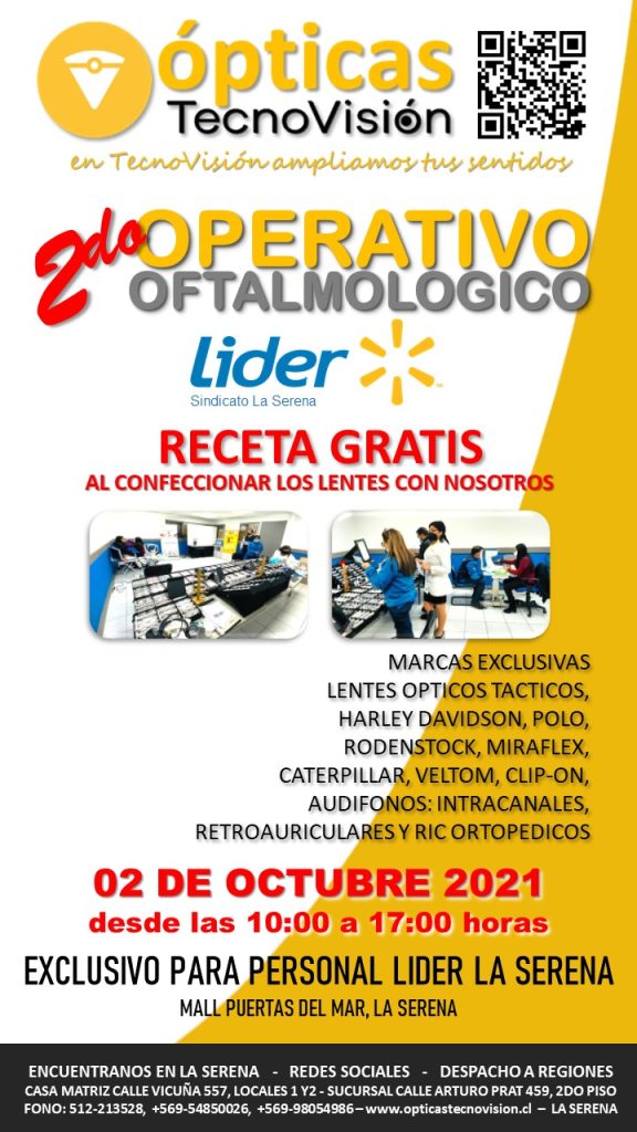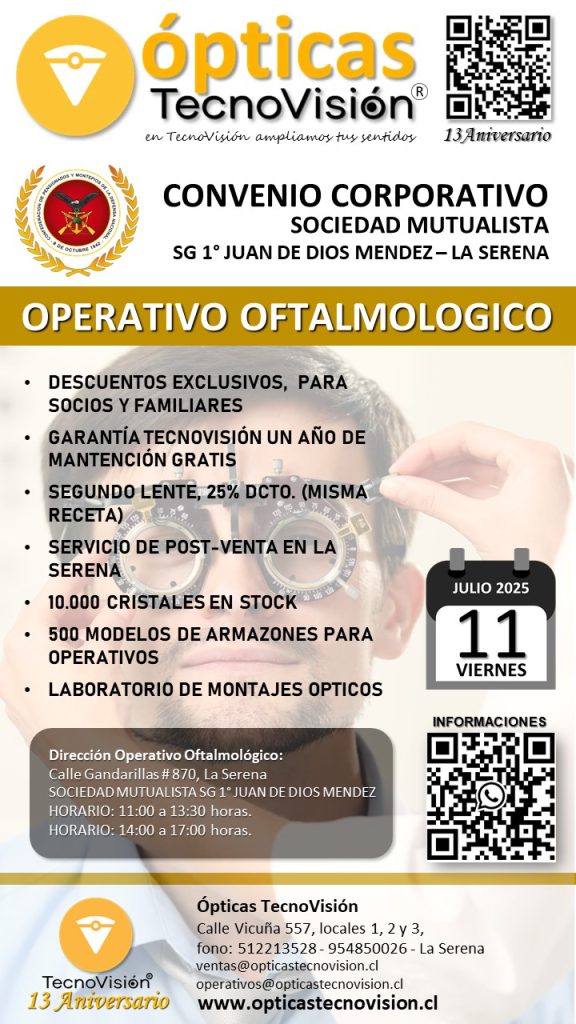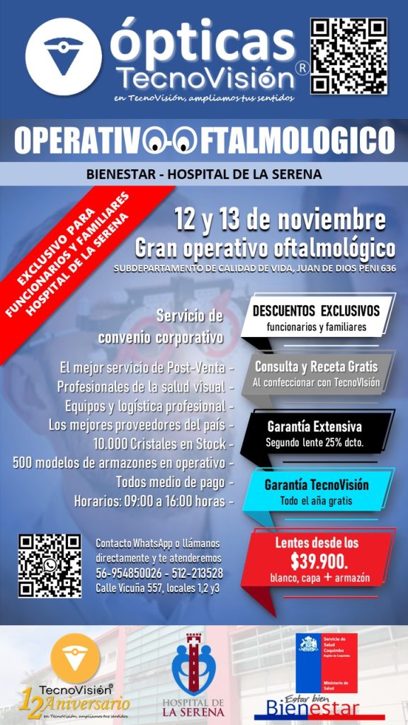 SABADO 30 DE MARZO DE 2024, DESDE LAS 11:00 HORAS, REALIZAREMOS UN OPERATIVO OFTALMOLOGICO PARA TODO PUBLICO DEDDE LOS 4 AÑOS DE EDAD EN ADELANTE, ESTE OPERATIVO LO REALIZAREMOS EN LA CASA MATRIZ DE TECNOVISION, CALLE VICUÑA 557, LOCALES 1 Y 2 DE LA SERENA.