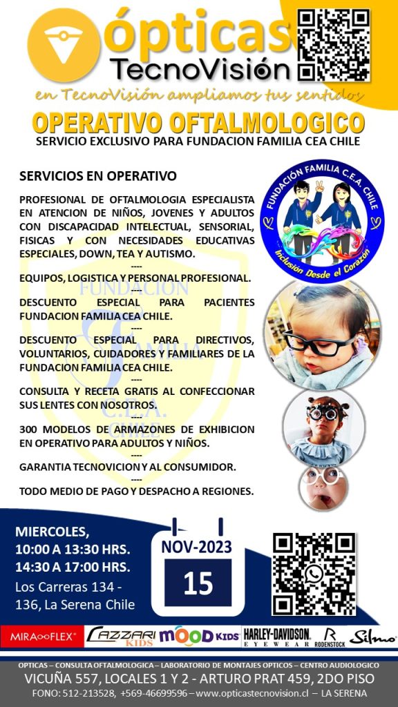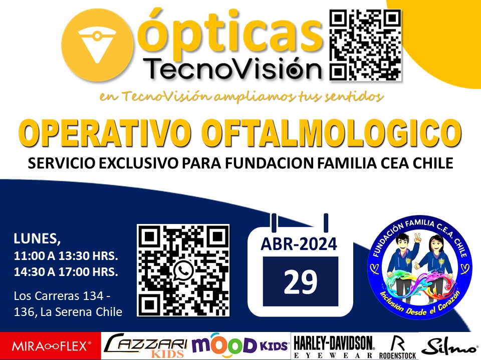 ESTE LUNES 29 DE ABRIL DE 2024, ESTAREMOS EN FUNDACION FAMILIA CEA CHILE REALIZANDO EL SEGUNDO OPERATIVO OFTALMOLOGICO Y AUDIOLOGICO. DESDE LAS 11:00 A 17:00 HORAS, EL PRESENTE OPERATIVO ESTA DIRIGIDO ESPECIALMENTE PARA LOS NIÑOS Y ADULTOS PACIENTES DE LA FUNDACION, TAMBIEN PARA PADRES CUIDADORES, FUNCIONARIOS Y VOLUNTARIOS DE FAMILIA CEA CHILE. ATENDEMOS PERSONAS DESDE LOS 4 AÑOS DE EDAD.