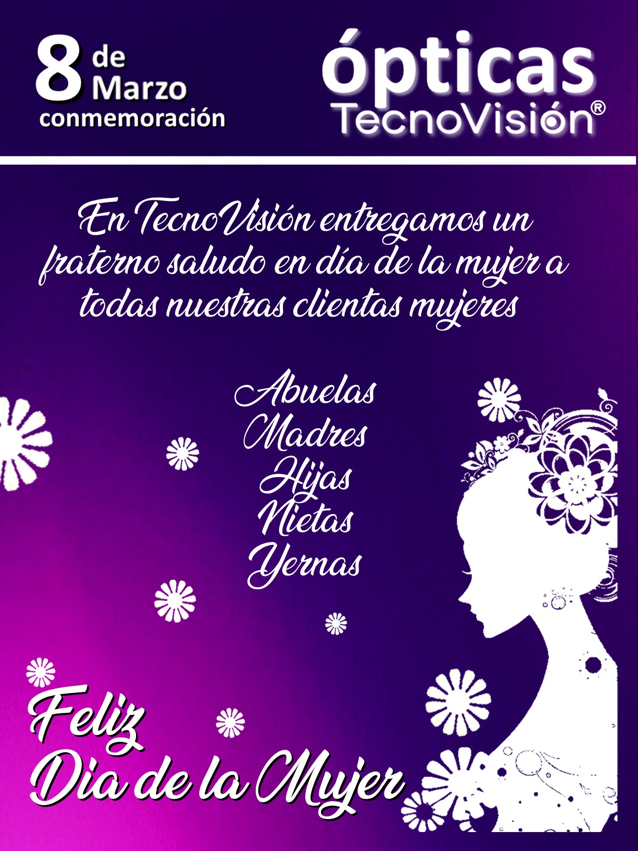 En Ópticas TecnoVisión entregamoos un fraterno saludo en el día de la Mujer a todas nuestras clientes Mujeres