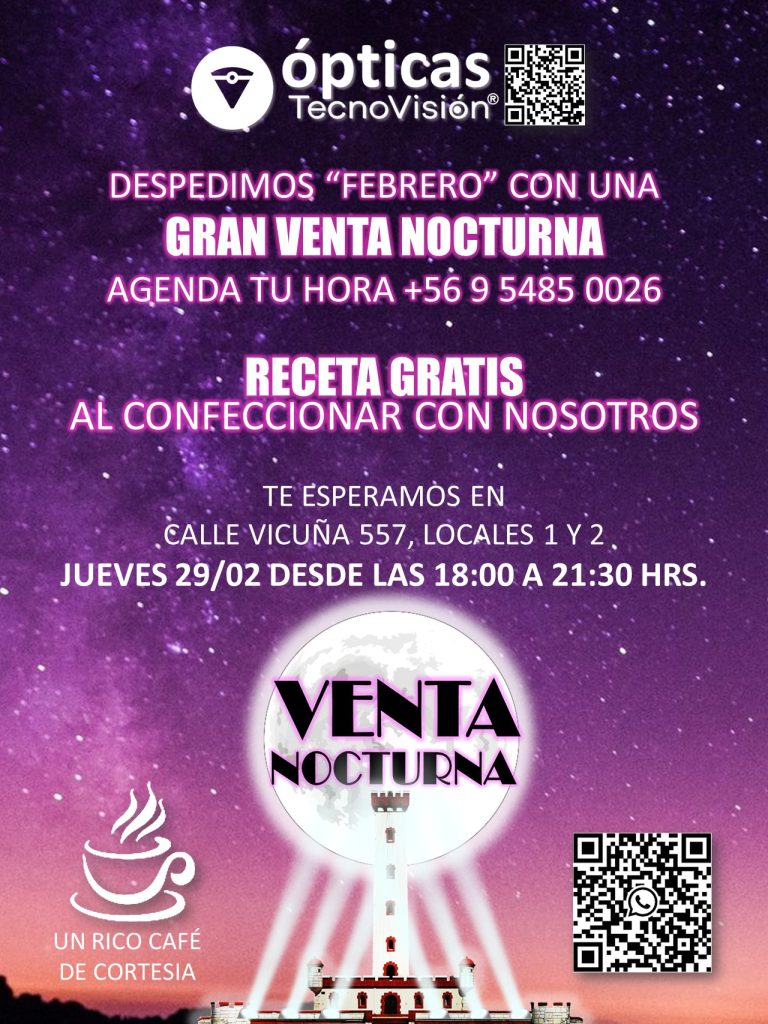 Para el día jueves 29 de febrero de 2024, se ha planificado una venta nocturna en Ópticas tecnoViión para el local de calle Vicuña 557, locales 1 y 2 en la ciudad de La Serene,desde las 18:00 a 21:30 horas.